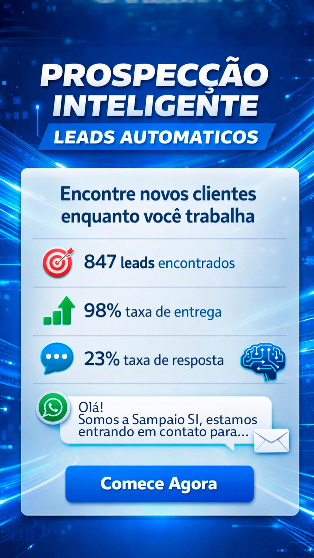 A IA encontra leads no google, envia mensagem no whatsapp e segue o fluxo até o momento certo. Ela aborda, responde, filtra e aquece, tudo no automático!
